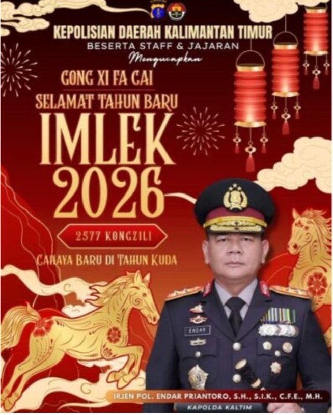 Ciwintara.id, Balikpapan – Menyambut perayaan Tahun Baru Imlek 2577 Kongzili (Imlek 2026), Kepolisian Daerah Kalimantan Timur menyampaikan ucapan selamat kepada masyarakat yang merayakan, khususnya warga Tionghoa di wilayah Kalimantan Timur. Momentum tersebut turut dimaknai sebagai ajang memperkuat kebersamaan dalam kehidupan bermasyarakat.
